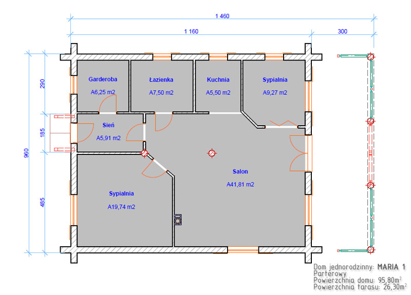 Dom parterowy przewidziany dla 3-4 osobowej rodziny z dwoma sypialniami i obszernym salonem.