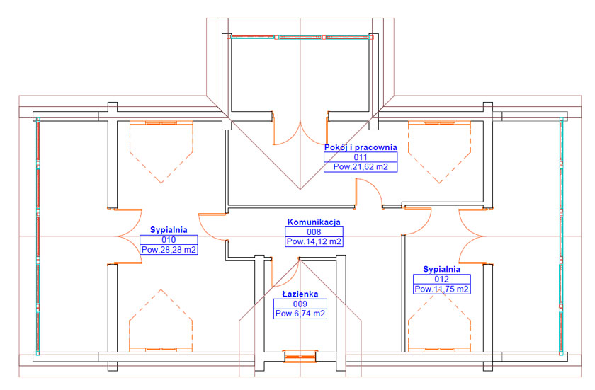 Dom z poddaszem mieszkalnym oraz dwoma tarasami w bryle budynku, przewidziany dla dużej rodziny. Każda sypialnia ma wyjście na taras lub balkon.